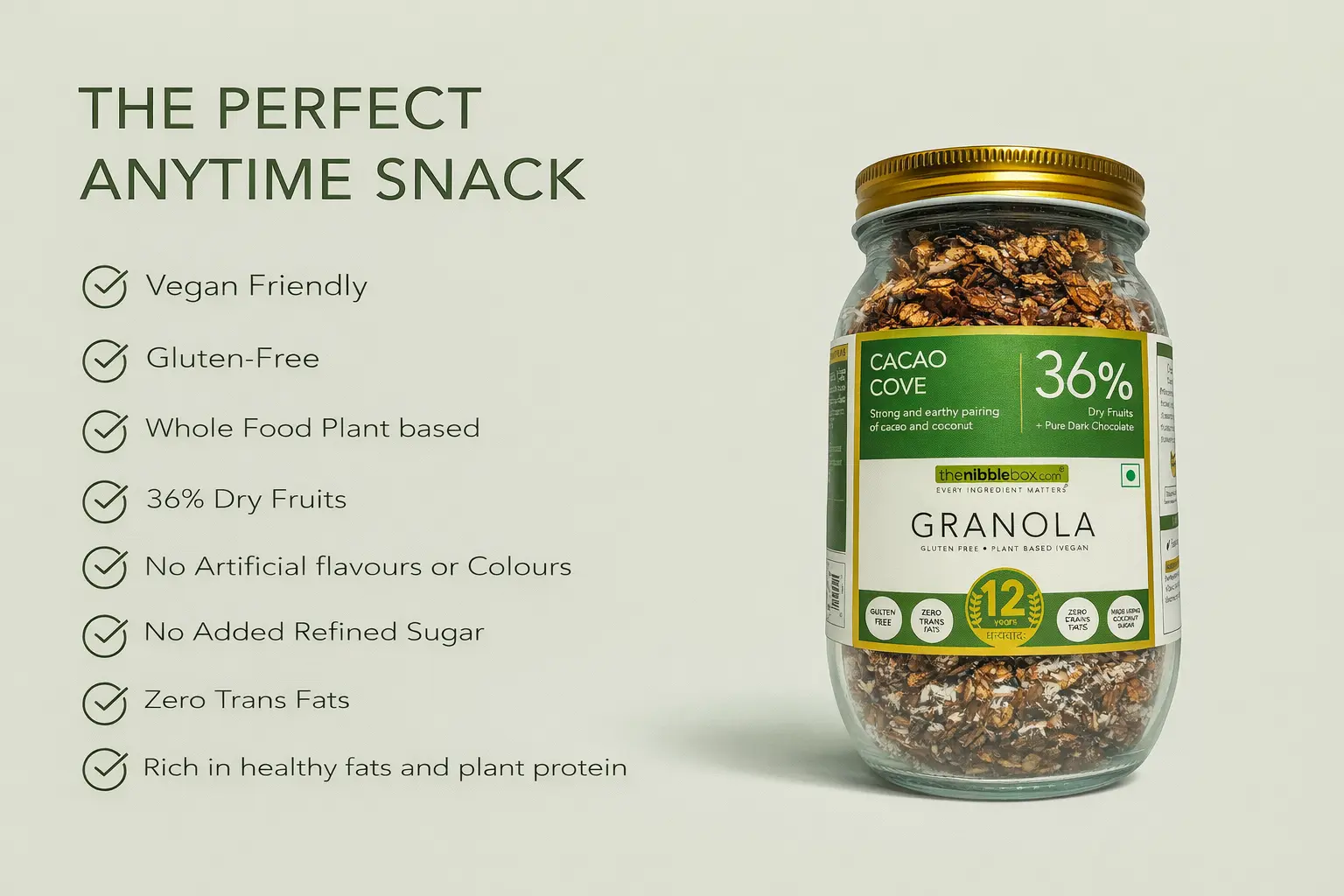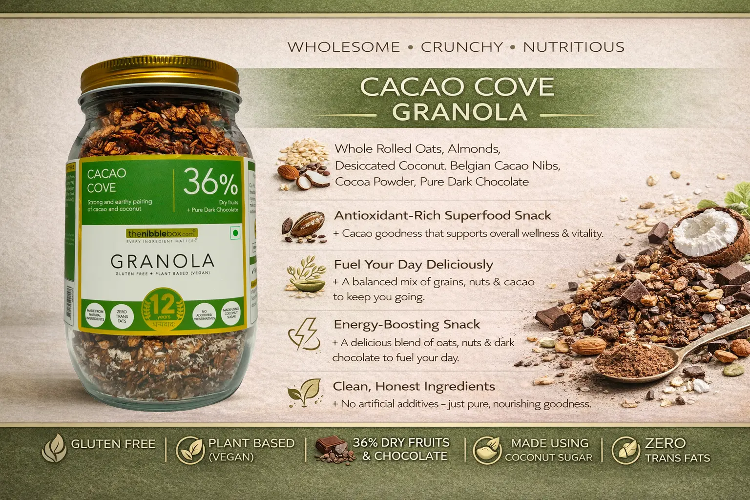 Cacao Cove Granola by The Nibble Box is a rich and satisfying granola crafted for chocolate lovers who want a healthier snack. Made with whole rolled oats, almonds, desiccated coconut, Belgian cacao nibs, cocoa powder, and pure dark chocolate, this delicious blend delivers a perfect balance of taste, crunch, and nutrition.