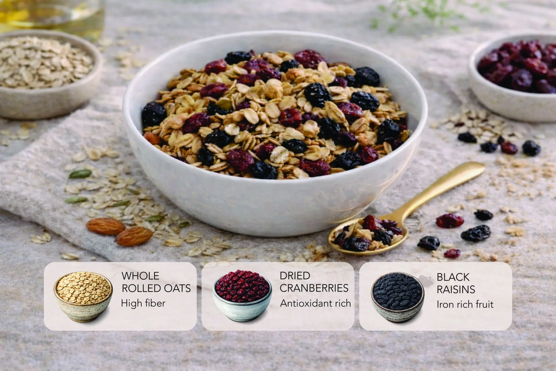 Whole oats provide dietary fiber and slow-release energy, making this granola perfect for breakfast or snacking.